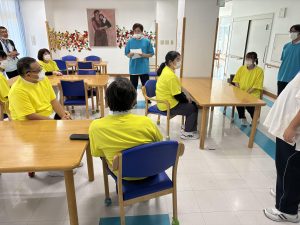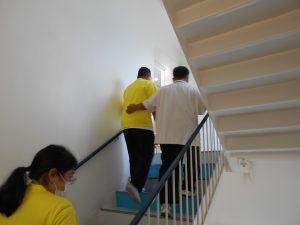 入居者様役(黄色シャツ)を、職員が介助しながら